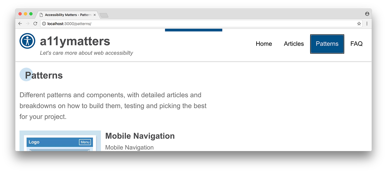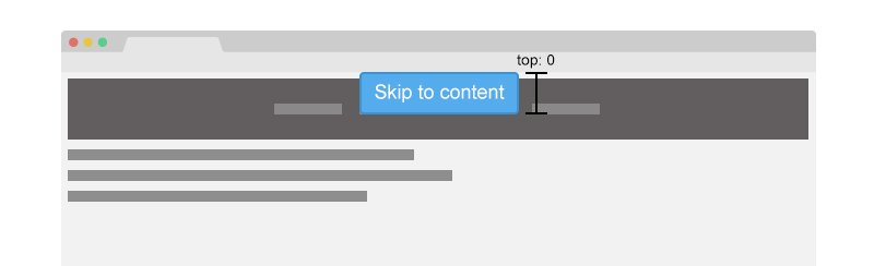 When setting the value of top property, be sure to test how it will look while changing the browser default font size. I didn’t take care of this point while working on a11ymatters design, notice the top edge of the browser. The skip link is not completely hidden off screen.