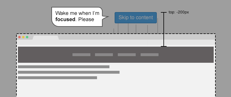 The idea is to place a link before all all focusable elements in the source order. That way, we can style the skip link and hide it off screen with CSS.