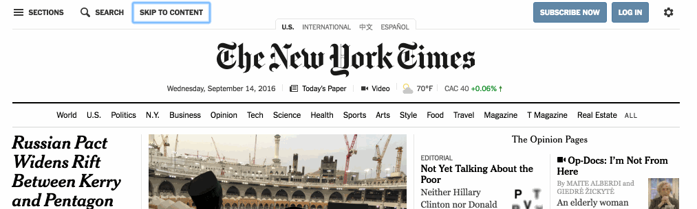 In small websites, it might be ok to tab through 5 links. Lets explore the below example of New York Times design.